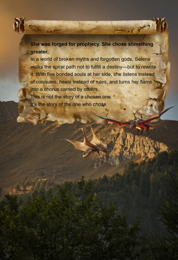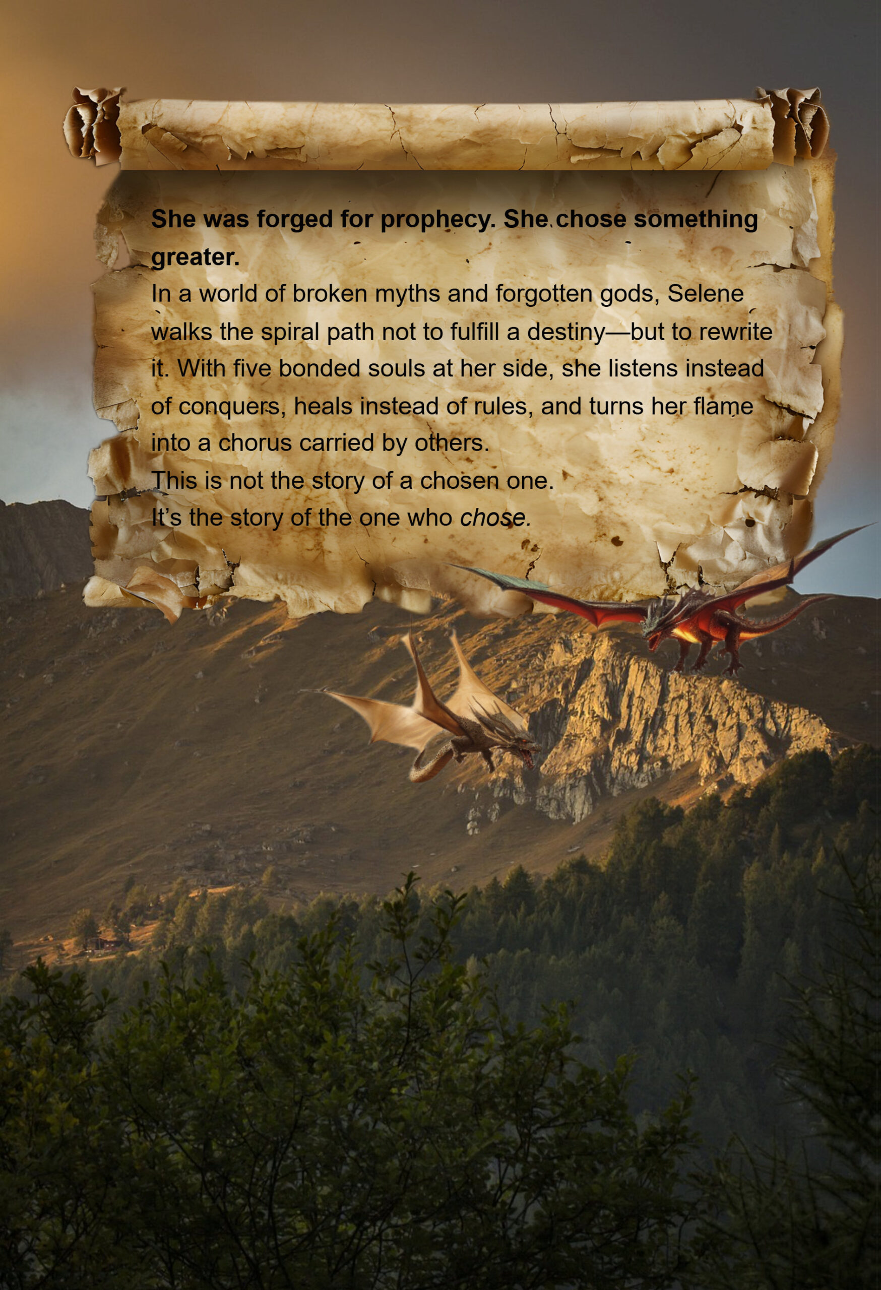 Haunted by grief and tangled in prophecy, Selene begins her journey believing herself a weapon forged for fate. But what she discovers—through fire, shadow, memory, and song—is not destruction, but integration. Alongside five companions who become her bonded heart—Finn, Rhydian, Darius, Eldric, and Aldric—she unravels the myth that once caged her and rebuilds it as something shared.